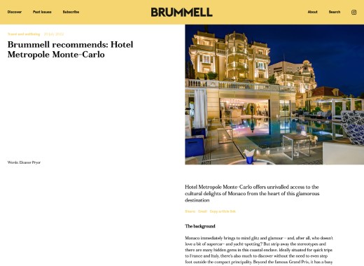Here is a curated selection of my work for Brummell, exploring subjects ranging from food and drink and horology to travel and culture – both print and online.